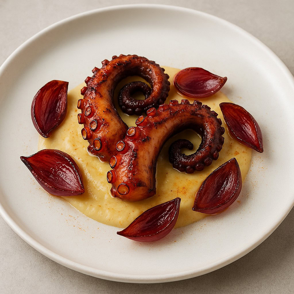 Polpo arrostito con crema di ceci affumicata e cipolle in agrodolce