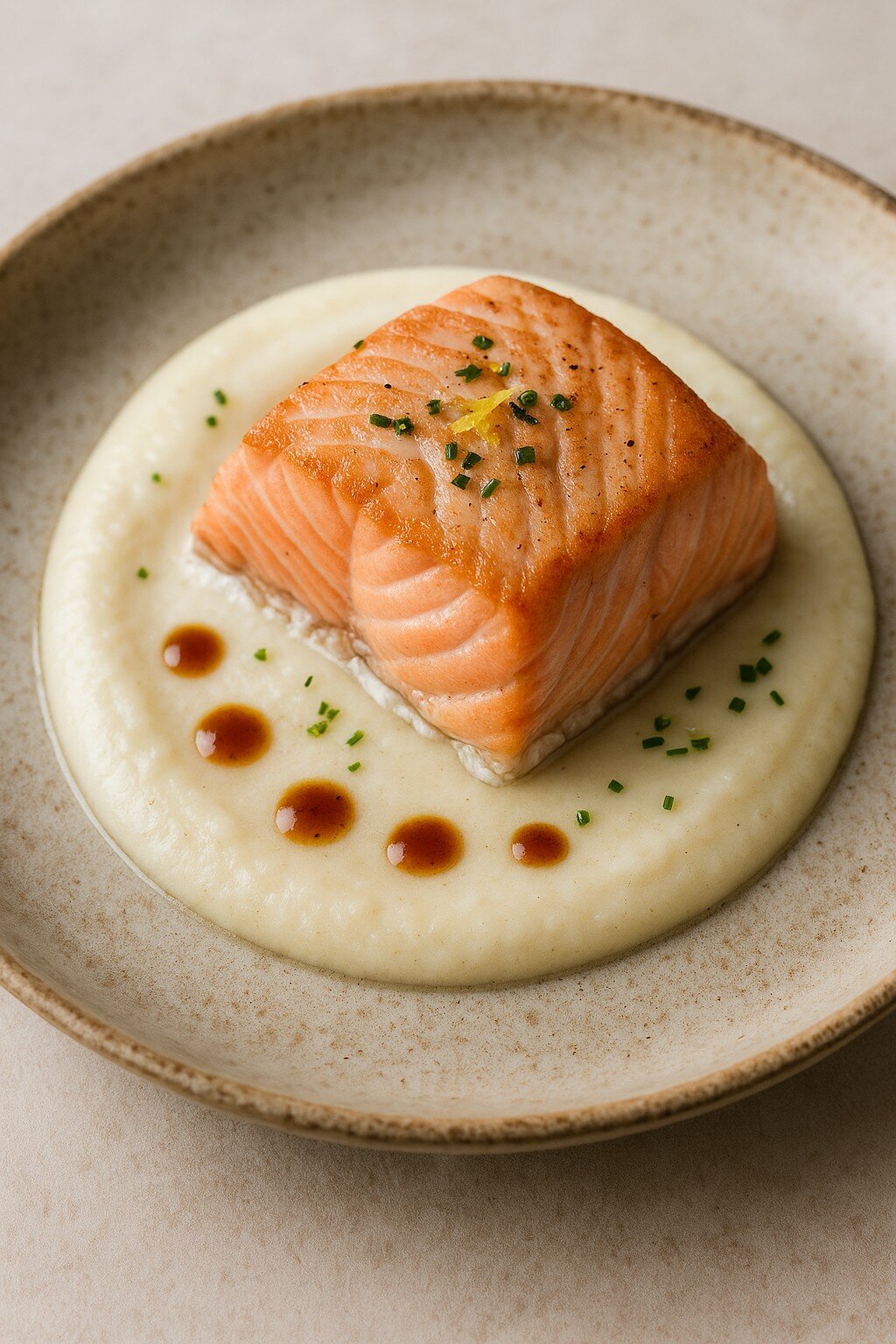 Un secondo gourmet essenziale: salmone mi-cuit (cuore setoso, superficie lucida), crema di cavolfiore liscia e un tocco iodato di colatura di alici in emulsione. Pochi elementi, equilibrio perfetto tra grasso, dolcezza e sapidità.