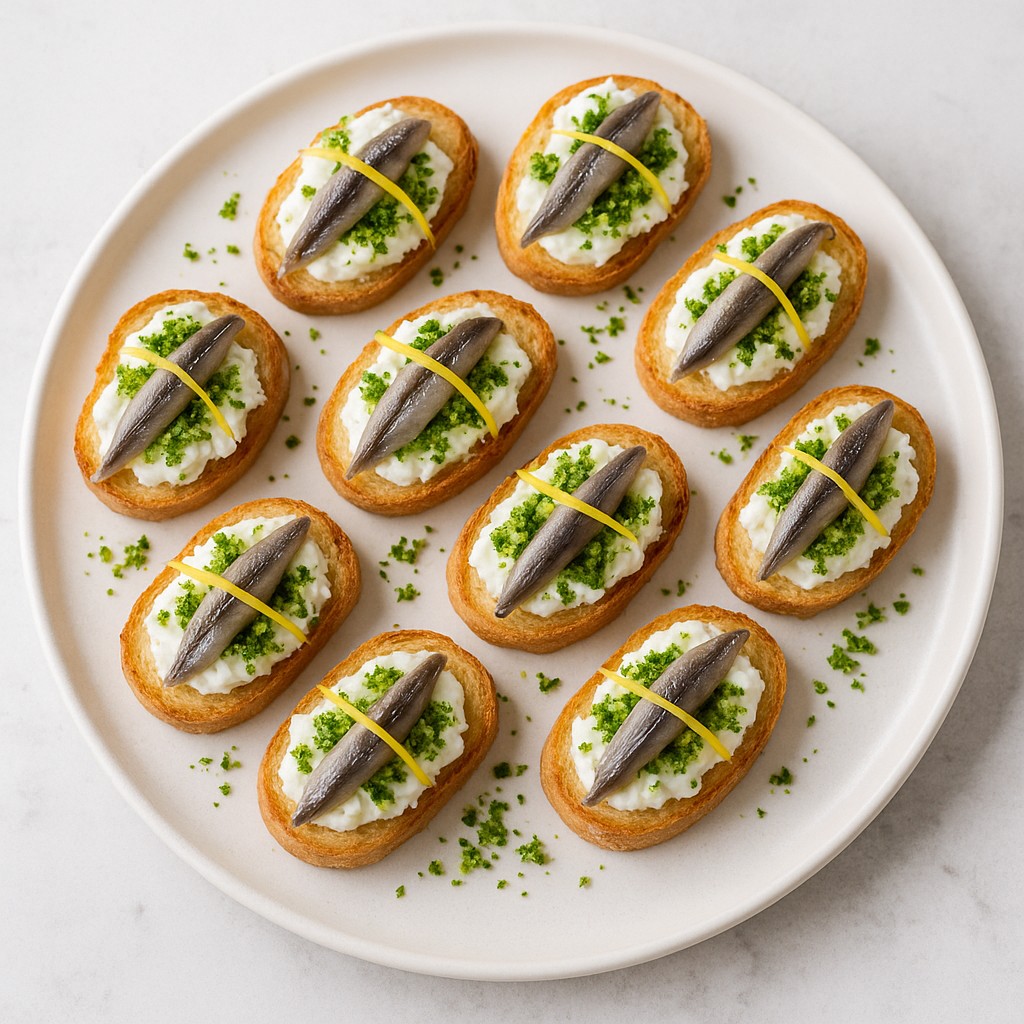 - Crostini burrata e alici con briciola verde (unico crostino)
