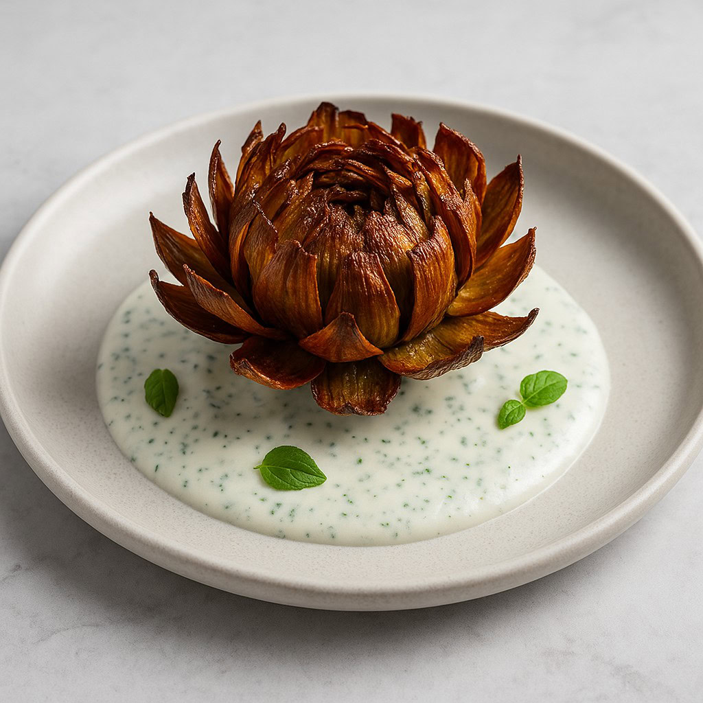 - Veg-option: crema di anacardi alla menta (anacardi ammollati + latte vegetale caldo + sale + succo di limone), mantenendo il carciofo fritto in olio vegetale.