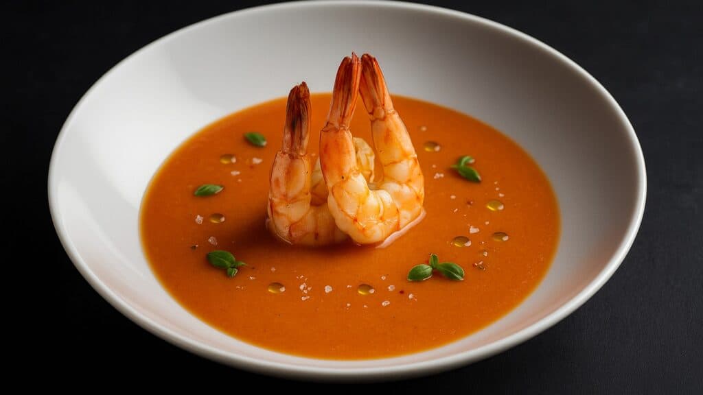 • Come servire: gazpacho freddo in bicchiere o fondina, 3 gamberi a porzione, finitura con erba cipollina e una micro-goccia di aceto.