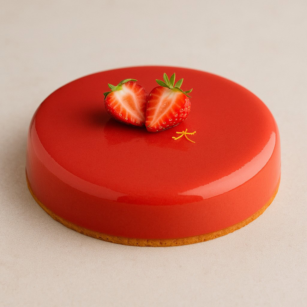 Fondi burro di cacao + cioccolato bianco, colora di rosso. Spruzza a 35–40°C sulle cupole ancora congelate (in box protetta). Trasferisci su dischi dorati, decora.