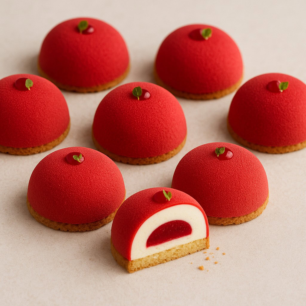 Piccole cupole eleganti con mousse alla vaniglia, cuore di frutti rossi e finitura velluto. Ricetta pensata per chi vuole iniziare con le torte moderne senza complicarsi: pochi passaggi chiari, risultato “da pasticceria”.