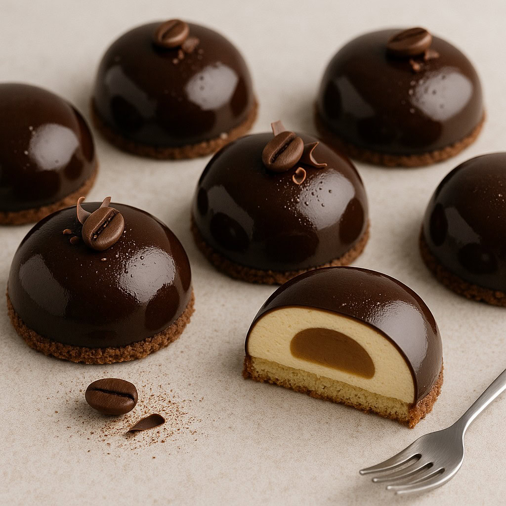 Riempi ogni cavità dello stampo Ø7 cm per circa 2/3 con mousse. Inserisci una mini semisfera di gelée al caffè congelata. Copri con altra mousse e chiudi con il disco di biscuit inzuppato (biscuit verso la mousse). Livella. Congela 6–8 ore (meglio notte) o abbattitore -30 gradi fino ad indurimento.