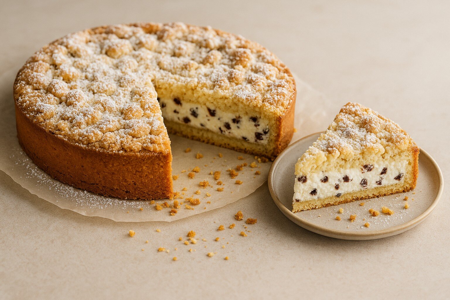 La sbriciolata alla ricotta è la torta “salva-merenda”: guscio croccante tipo frolla a briciole, ripieno cremoso di ricotta e gocce di cioccolato. Si impasta in 5 minuti senza stendere: metà briciole sotto, crema al centro, briciole sopra. Taglio pulito, gusto pazzesco. 😉