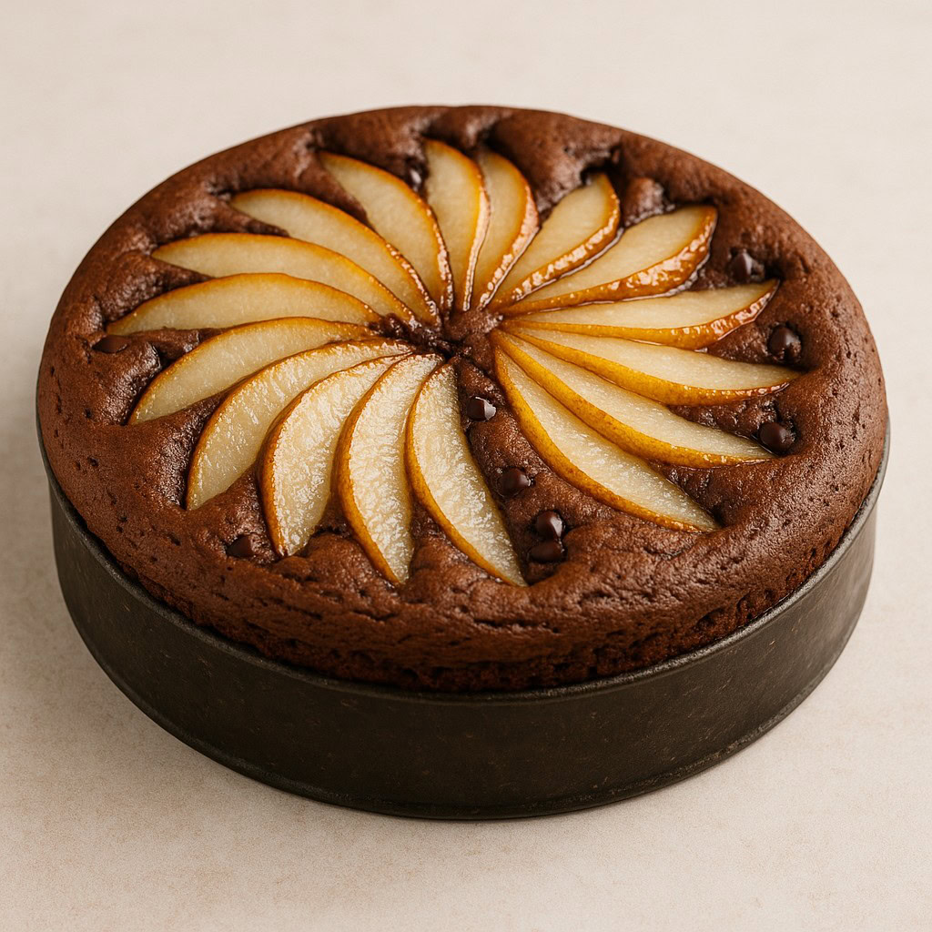 Un grande classico da merenda: impasto al cacao morbido e umido, pere a ventaglio in superficie che caramellano delicatamente e qualche goccia di cioccolato nell’impasto per più golosità. Ricetta semplice, affidabile e perfetta a fette alte.