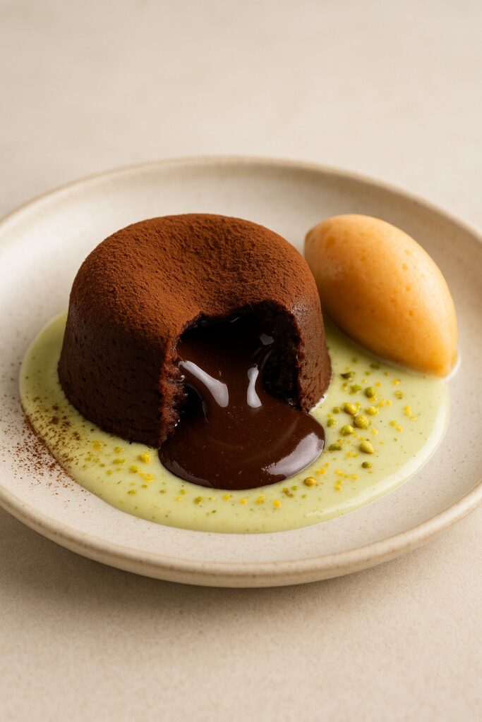 Qui il cuore cremoso lo ottieni per sottocottura controllata: impasto facile, stampini ben imburrati e 8–9 minuti di forno. Completa con salsa inglese alla vaniglia rifinita con pasta di pistacchio (effetto a specchio sul piatto) e una quenelle di gelato all’albicocca per un contrasto acido-fruttato irresistibile. ✨
