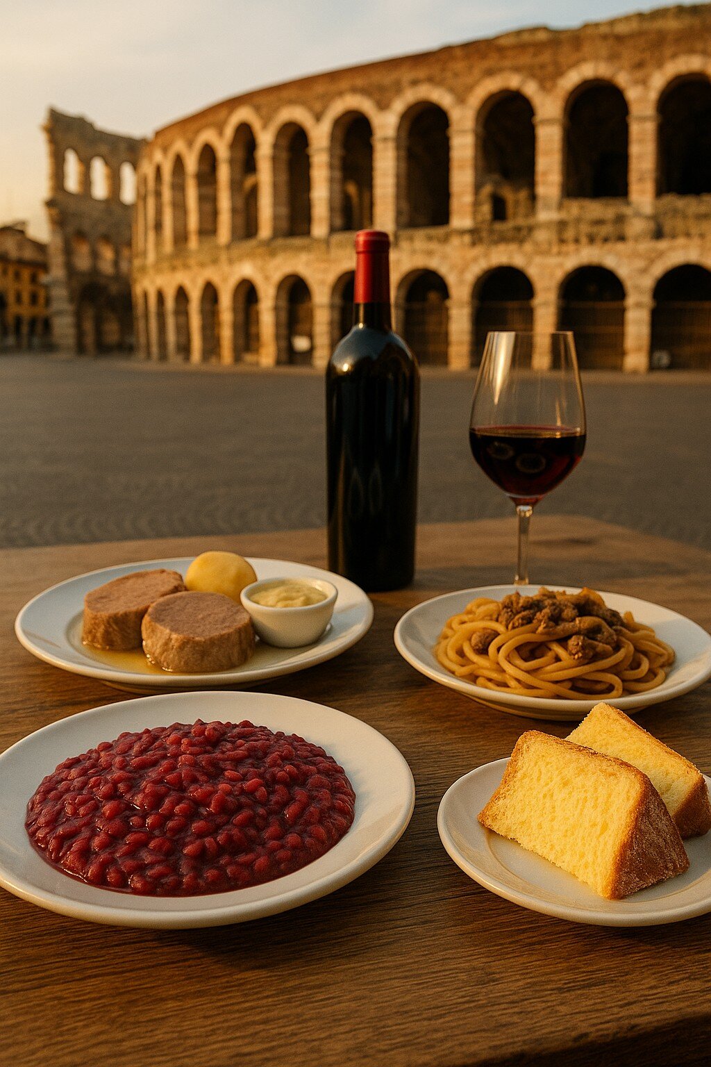 Il piatto simbolo è il risotto all’Amarone, preparato con il vino rosso più celebre della Valpolicella: cremoso, elegante e avvolgente. Non meno importante è la pastissada de caval, uno stufato di carne di cavallo cucinato lentamente con vino e spezie, piatto identitario e robusto.