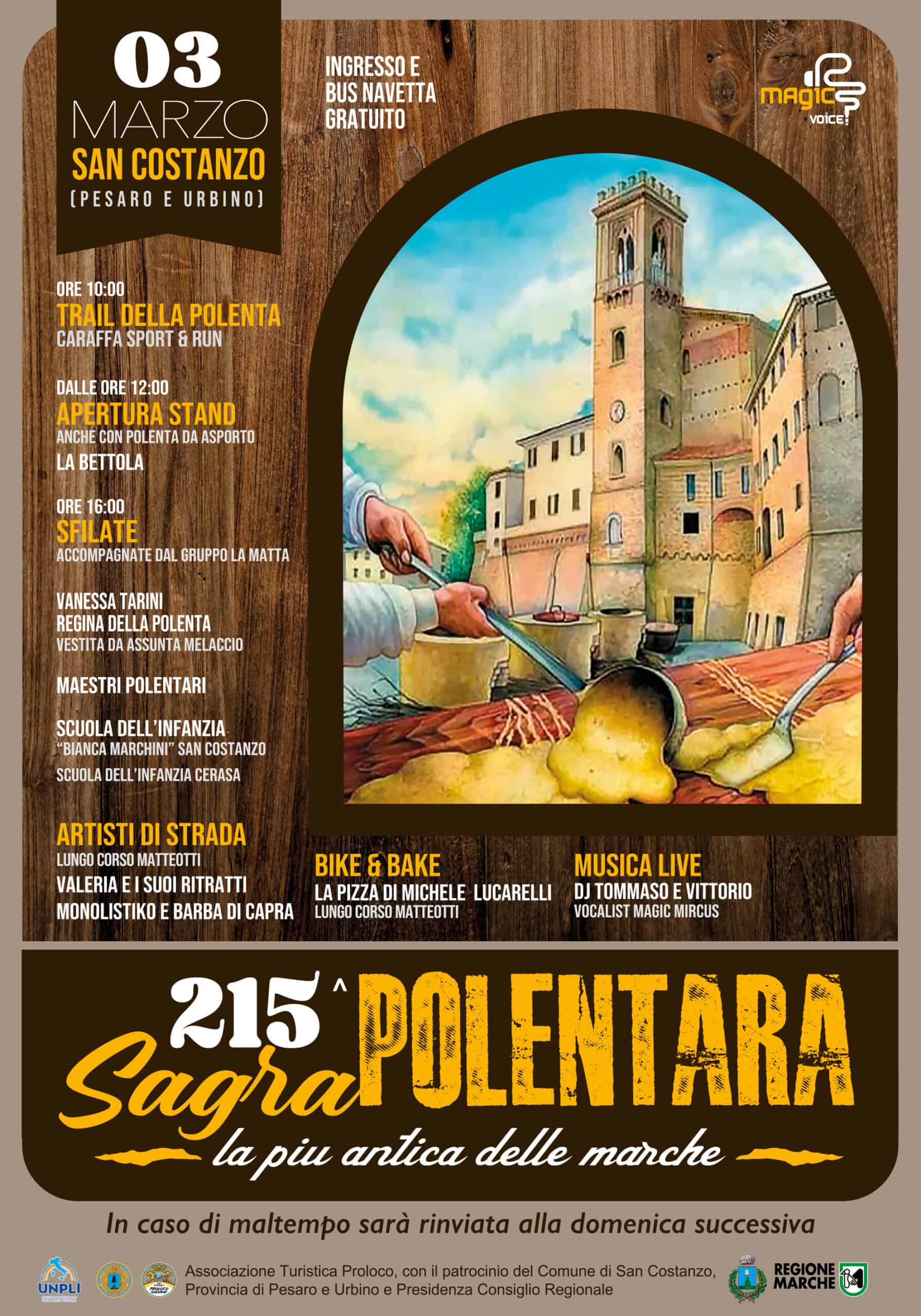 La sagra polentara di San Costanzo, organizzata dalla pro-loco cittadina e patrocinata dal comune e dalla Presidenza del Consiglio della Regione Marche, ha quest’anno raggiunto la 204 esima edizione. Oltre 100 volontari hanno dato vita alla sagra più antica delle Marche, coinvolgendo il borgo cittadino con stand gastronomici, musica, arte e cultura. Un evento nell’evento. Alla sagra polentara, si celebra anche il gemellaggio con la cittadina tedesca di Weisemberg, rappresentata dai rispettivi sindaci, e da diverse associazioni culturali tra le quali la fanfara di Weisemberg che se è esibito con il gruppo folkloristico “ La Matta di San Costanzo”.