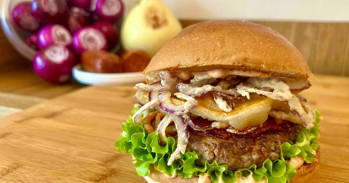 Hamburger con ’nduja, caciocavallo silano e cipolla di Tropea in tempura