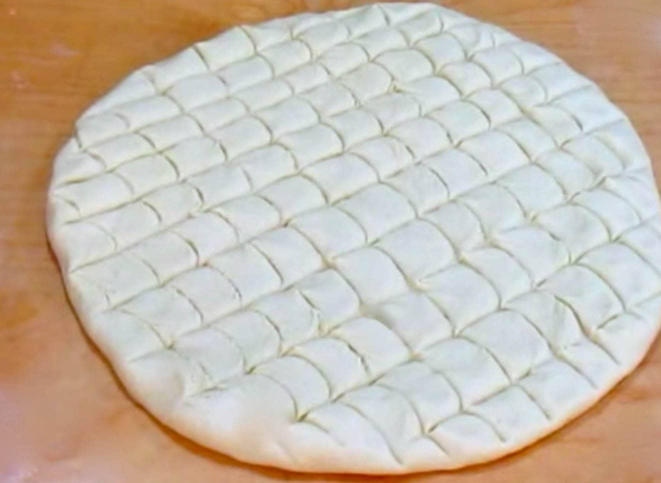 Ungi uno stampo, o rivestilo con carta da forno. Stendi l’impasto a uno spessore di 1 centimetro e mezzo. Con la punta di un coltello affilato pratica delle incisioni su tutta la superficie. Per aiutarti guarda l’esempio nella foto.