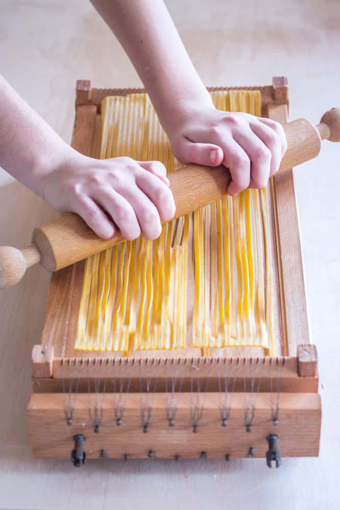 Con il matterello passalo più volte sulla pasta, premendo il necessario per tagliare la pasta.