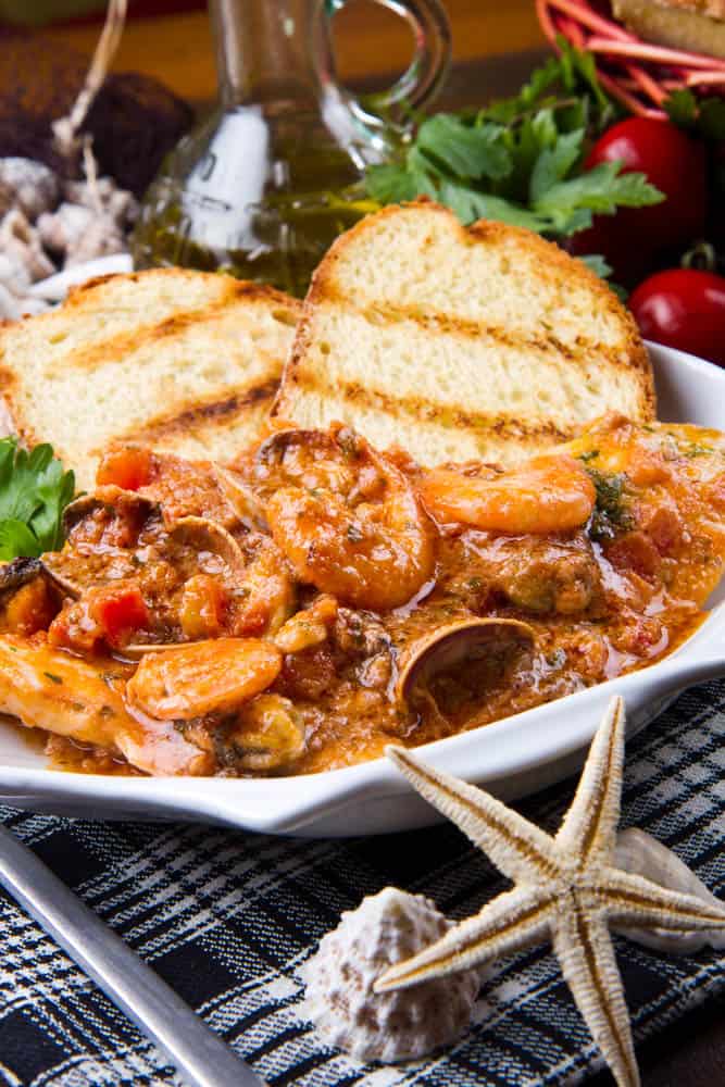 - 1,5 chilogrammi di pesce misto fra: palombo, seppie, triglie, coda di rospo (o pescatrice), canocchie, granchi, scorfani, calamari, merluzzi, sogliole, cozze, vongole, polpo, mazzancolle e scampi.