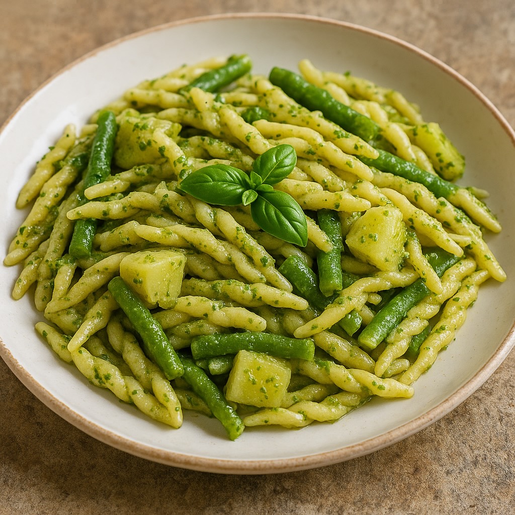 La tradizione vuole che le patate a dadini e i fagiolini freschi vengano cotti direttamente nell’acqua della pasta: così rilasciano amido e dolcezza, donando al condimento quella consistenza morbida e avvolgente che fa delle trofie al pesto un capolavoro di semplicità.