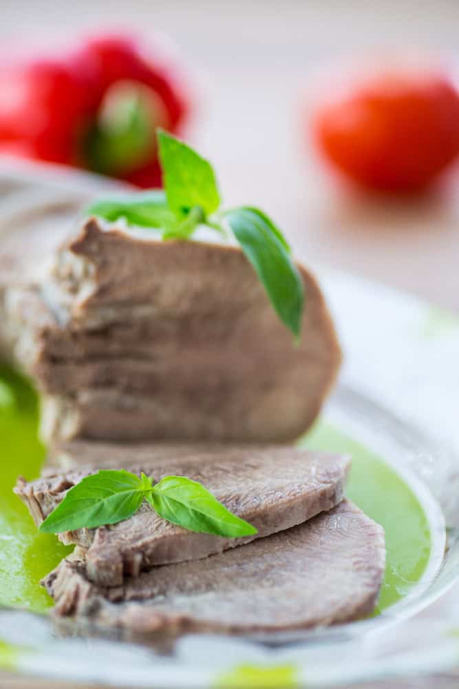 La lingua in salsa verde è una specialità tipica della cucina piemontese. Servita come antipasto o come piatto freddo, questa ricetta è adatta a tutte le stagioni e a diverse occasioni. Basta infatti un contorno leggero per trasformarla in un insolito secondo per una cena estiva, ed è adatta anche come piatto da buffet. La lingua viene tagliata in fettine sottili, ricoperte da una salsa molto saporita. Detta anche “bagna”, la salsa verde piemontese è a base di prezzemolo, aglio, pane bagnato con aceto, acciughe, capperi e cetriolini sott’aceto. Utilizzata per accompagnare carni bollite e tomini freschi, è una preparazione cardine del ricettario piemontese. Qui trovi tutte le istruzioni per portarla in tavola.