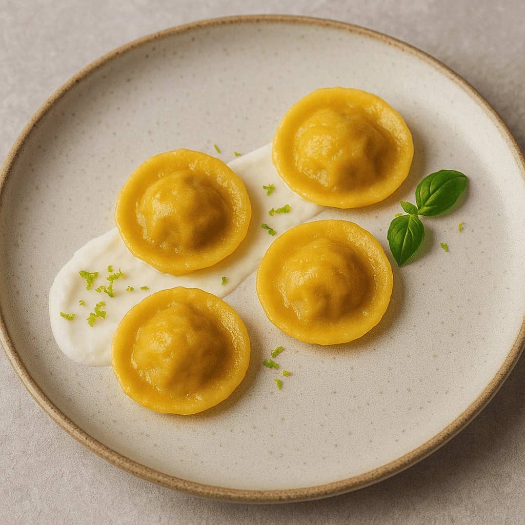 6. Impiattamento: stendi la crema di burrata sul fondo, disponi i ravioli e completa con zest di lime e foglie di basilico o menta.