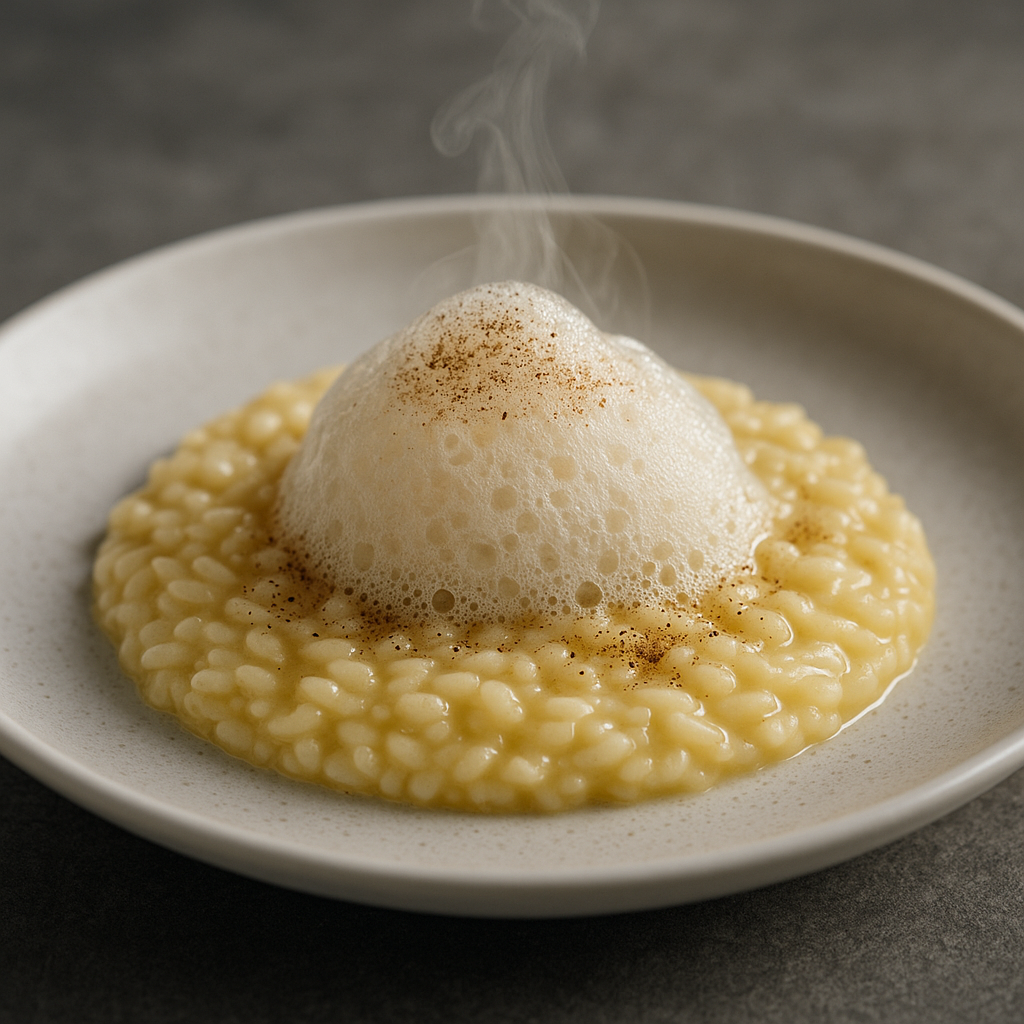 Questo risotto è un omaggio alla cucina molecolare italiana consapevole: niente eccessi, solo tecnica al servizio della purezza del sapore.