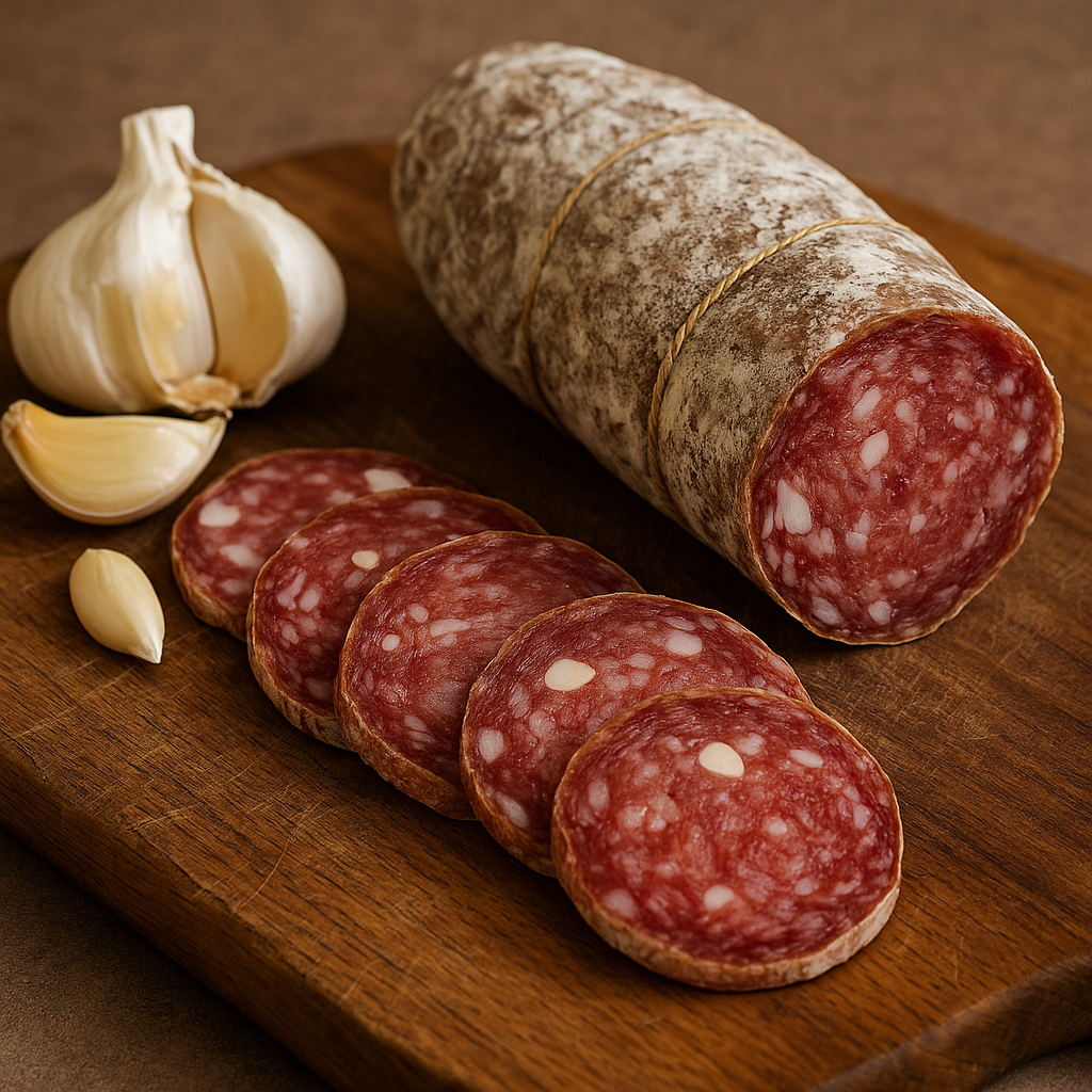 Un salume fiero e gentile insieme, con quell’aroma inconfondibile d’aglio che non domina, ma accompagna, come una voce bassa che sussurra storie di casa.