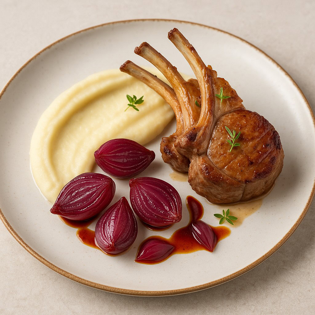 Un secondo piatto gourmet e raffinato, che unisce la delicatezza dell’agnello con la dolcezza del purè di sedano rapa e la rotondità delle cipolle glassate. Un equilibrio tra note aromatiche, consistenze morbide e contrasti agrodolci, ideale per una cucina creativa ma non troppo complessa.